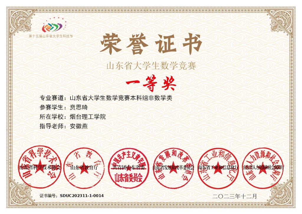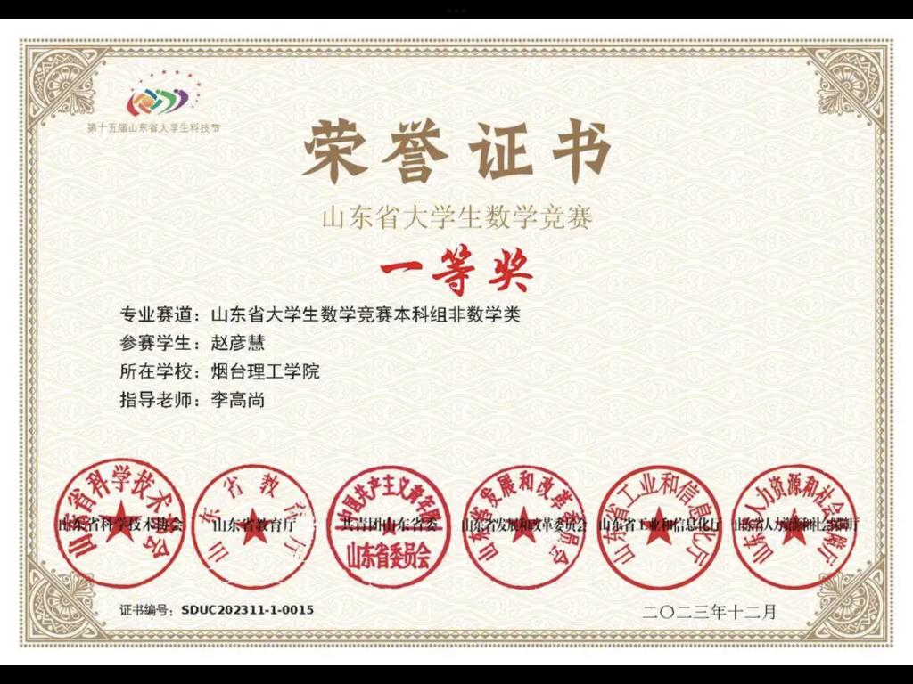 第十五届山东省大学生数学竞赛(非数学类)荣誉证书