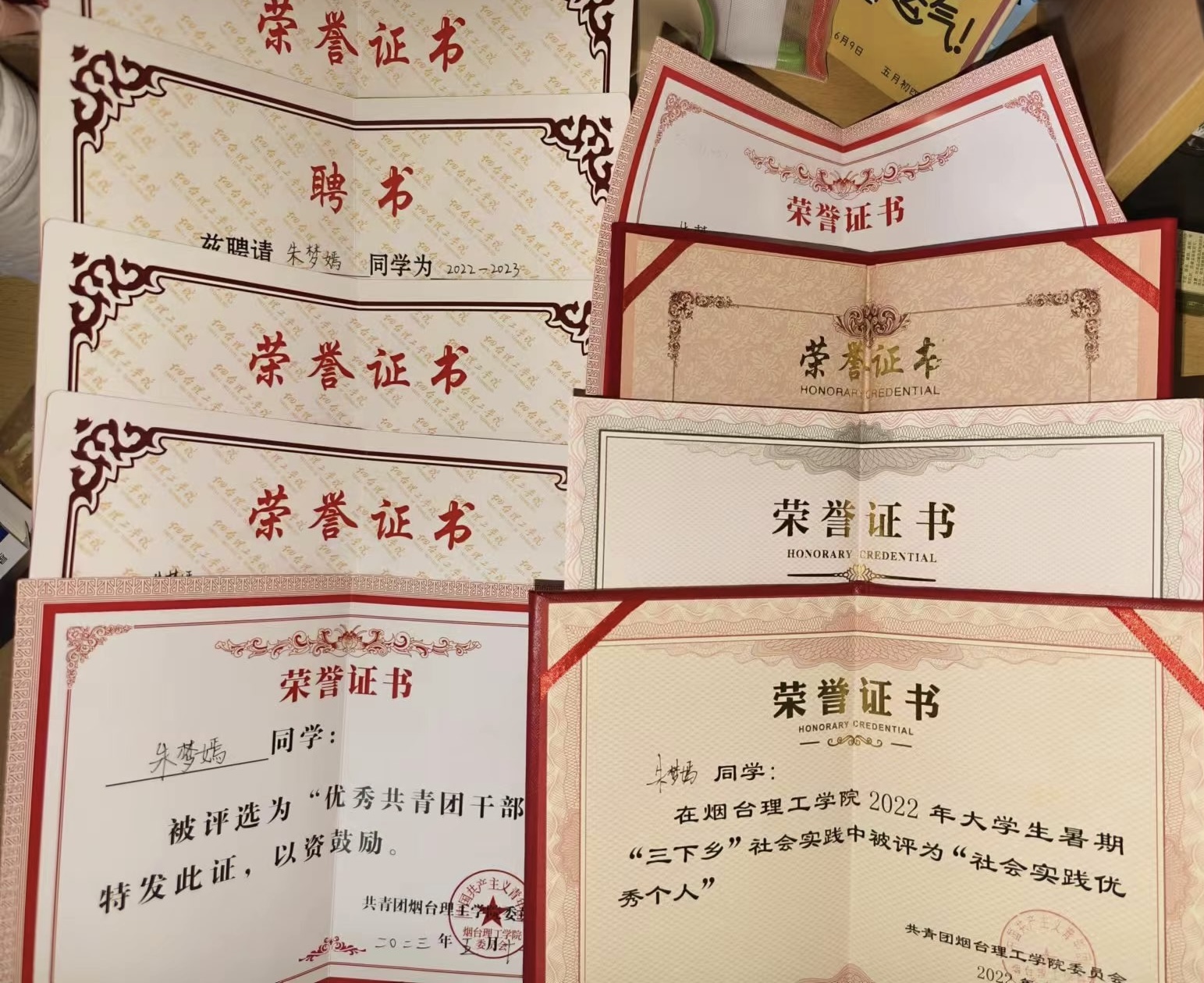 在校期间,朱梦嫣取得英语专业四级证书、大学生英语四级/六级证书