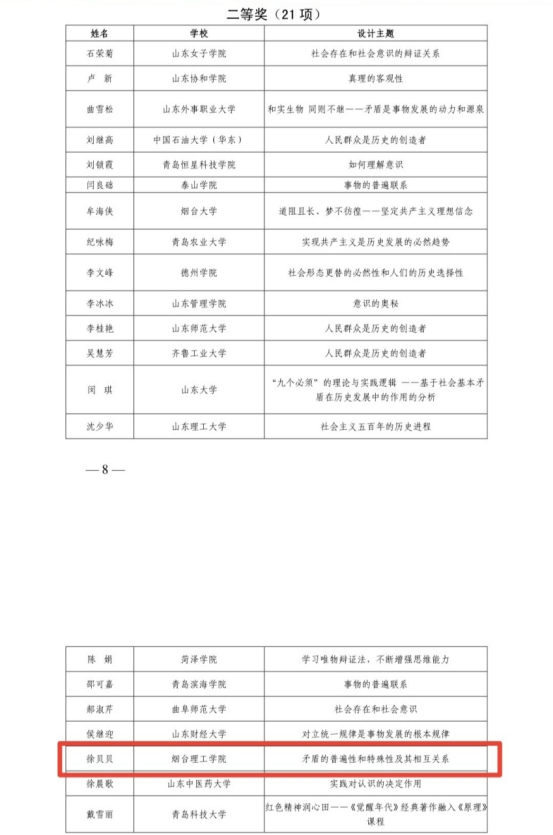 2022年1月11日,山东省教育厅公布了“首届全省学校思政课教学设计大赛”获奖名单,我院徐贝贝老师的“矛盾的普遍性和特殊性及其相互关系”设计主题获得了《马克思主义基本原理》组二等奖”。