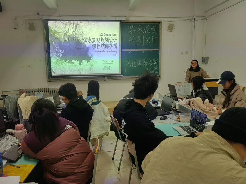 为促进良好的课程改革,推动应用型课程建设,2024年12月12日,建筑工程学院环境设计教研室举办了一场《滨水景观规划设计》课程观摩课,本次观摩课由环境设计专业教师纪小菲老师主持,面向环境设计专业2022级学生进行景观实践答辩。环境设计教研室主任邢国涛老师、专业教师刘靖坤老师、张菁艺老师、姜明汝老师参加了此次观摩课。