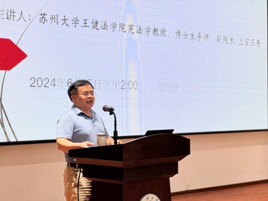 为进一步弘扬宪法精神,加深法学学生对宪法的理解与运用,提升其法学素养,6月15日,苏州大学法学院上官丕亮教授应邀到我校作主题为“普通法律适用中的宪法实施”的星空体育平台登录入口。本次讲座由文法学院党总支书记曹钊庆主持,出席讲座的有星空·体育登录入口科研处副处长徐嵩杰,文法学院法律系主任吴淑霞、烟台大学法学院教授崔雪丽以及文法学院部分师生。